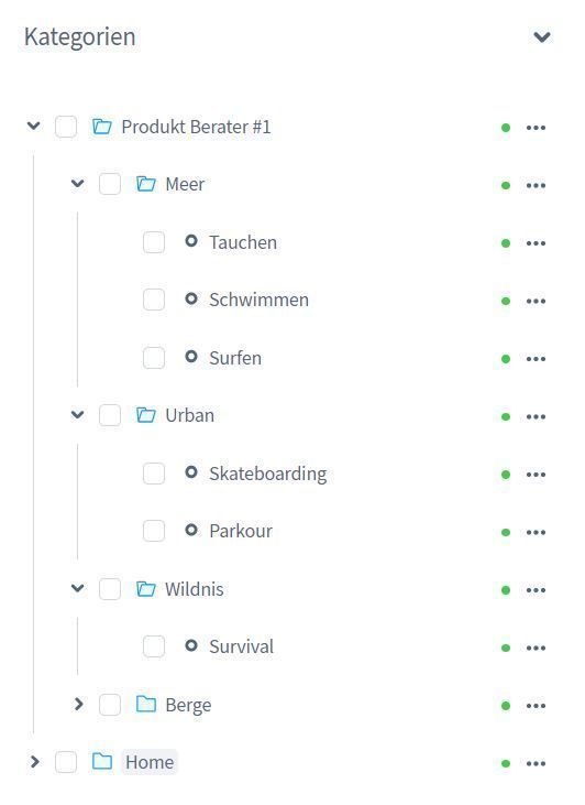 Die Entscheidungsstruktur wird über die Kategorien von Shopware erstellt. Lege dazu eine neue Kategorie im Root an und ersteller für jede Antwort eine Unterkategorie.