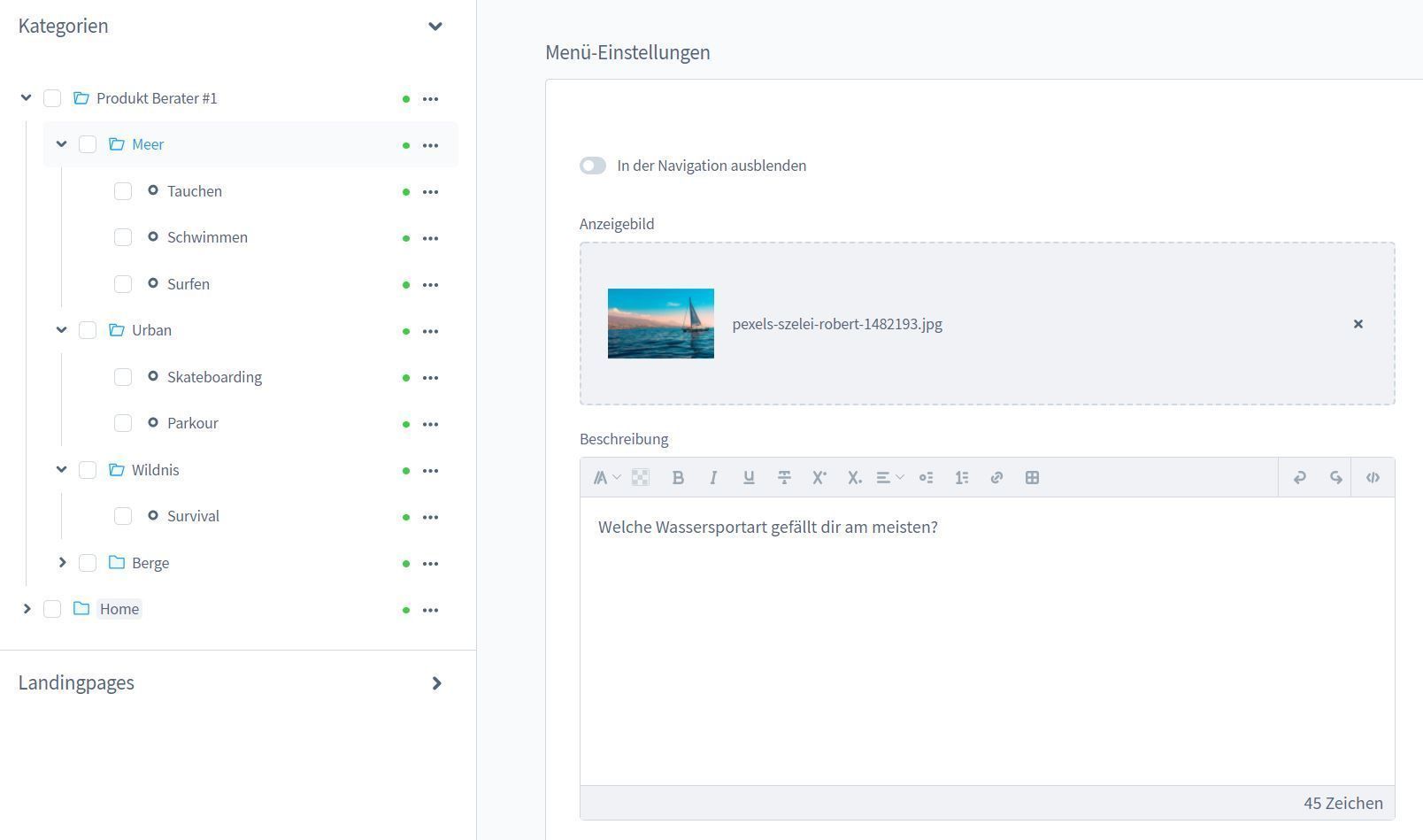 In der letzten jeweiligen Unterkategorie kannst du nun die zu der Entscheidung Deines Kunden passende Produkte zuweisen. Anschließend legst du eine CMS Seite fest.