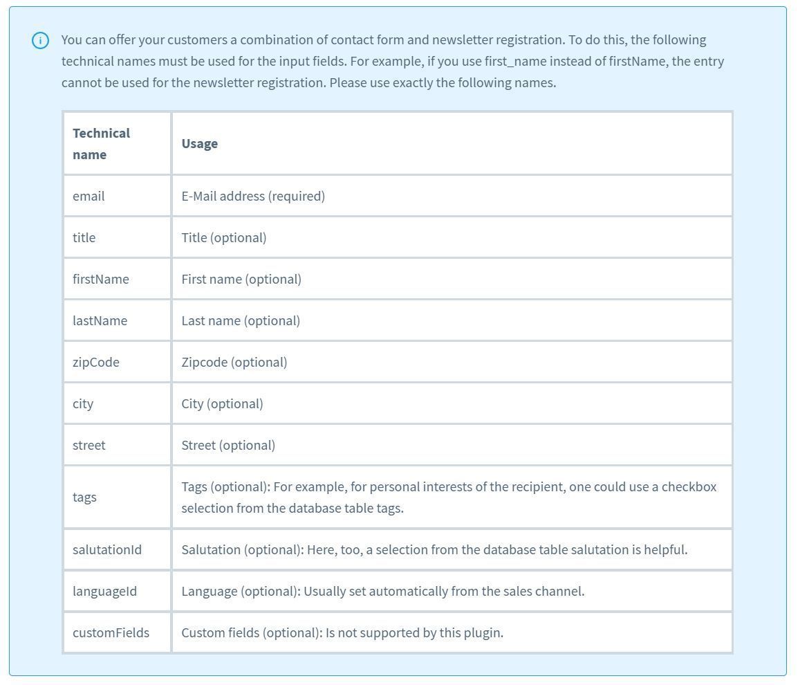 Hinweis zu den technischen Namen der Elemente, wenn die Newsletter-Anmeldung aktiviert ist.