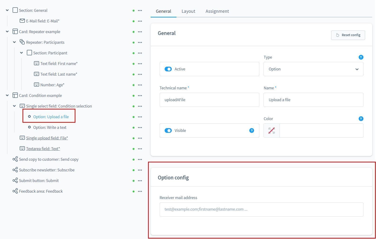 Anhand einer ausgewählten Option kann die Empfänger E-Mail-Adresse beeinflusst werden. So landen je nach Anfrage-Typ die Mails im richtigen Postfach!