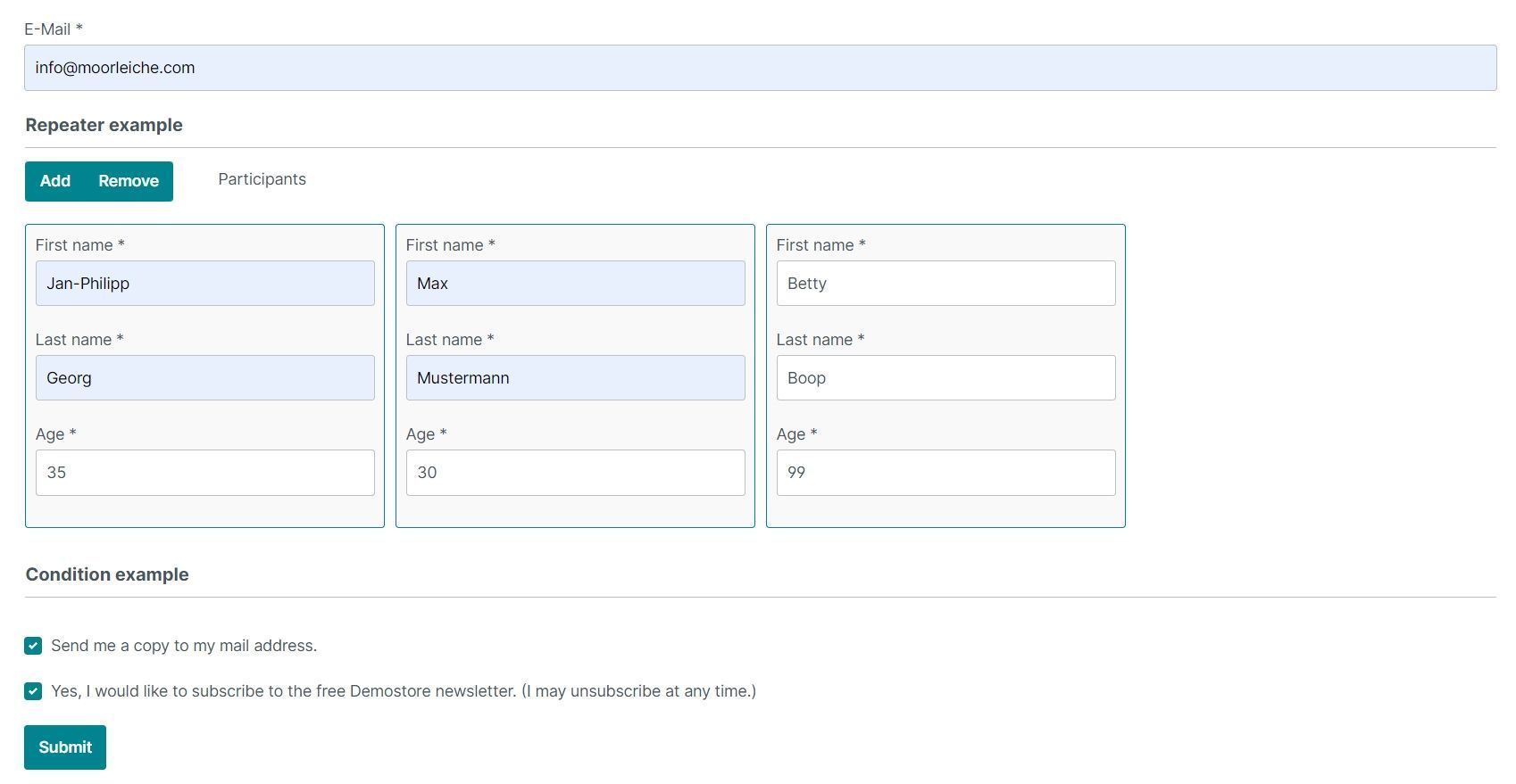 Das Repeater-Element kann eine min und eine max Eigenschaft haben. Außerdem lassen sich die Buttons individuell beschriften.