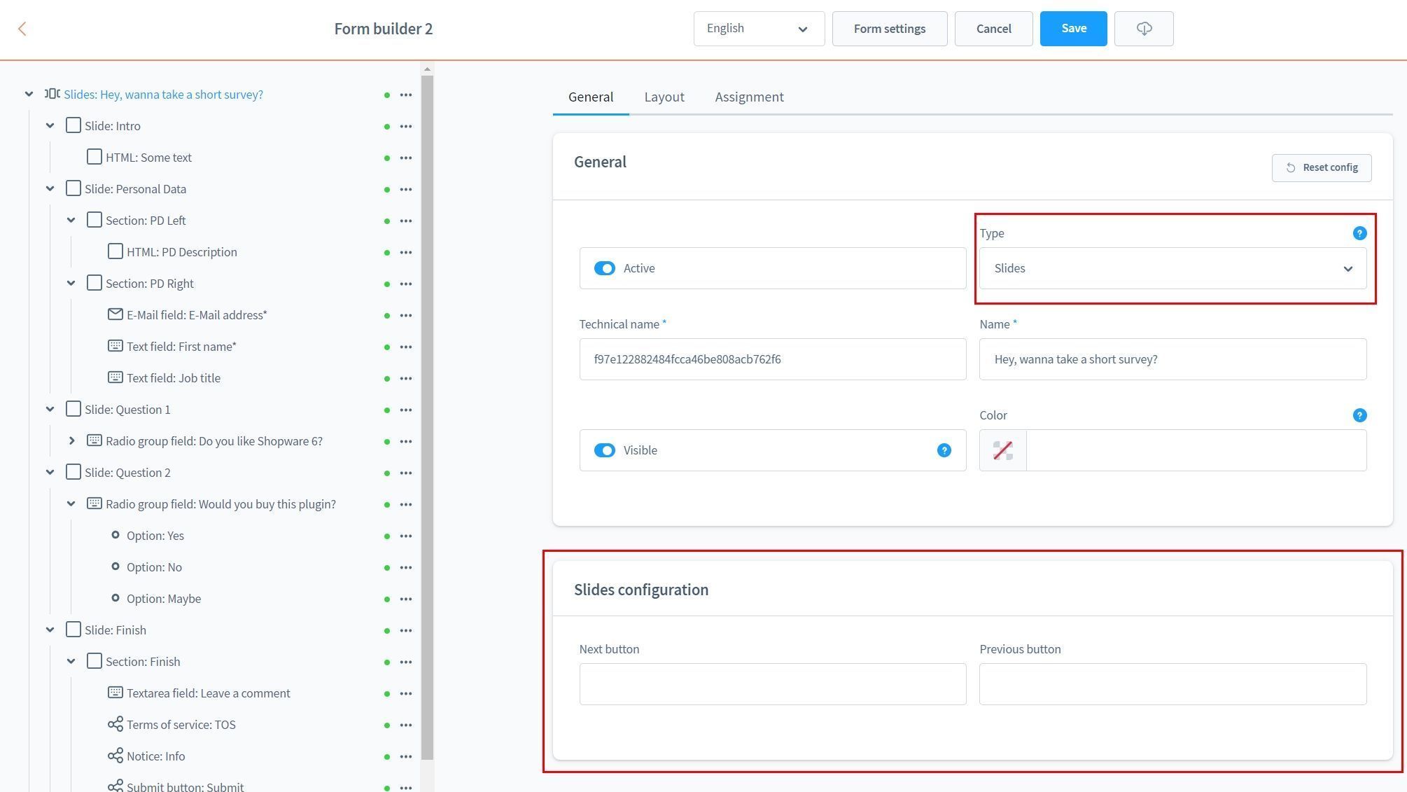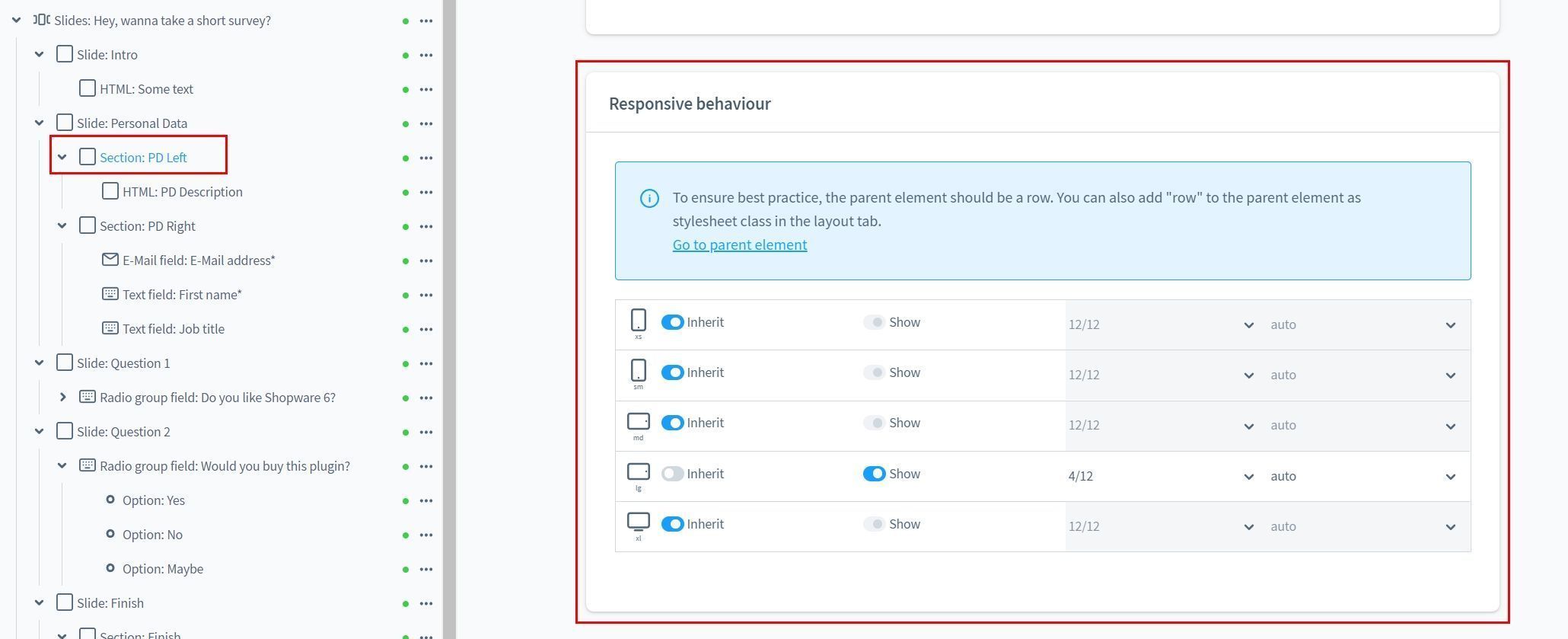 Jedes Slide-Element unterstützt responsive Unter-Elemente, nutze diese Einstellung um die Felder auszurichten.