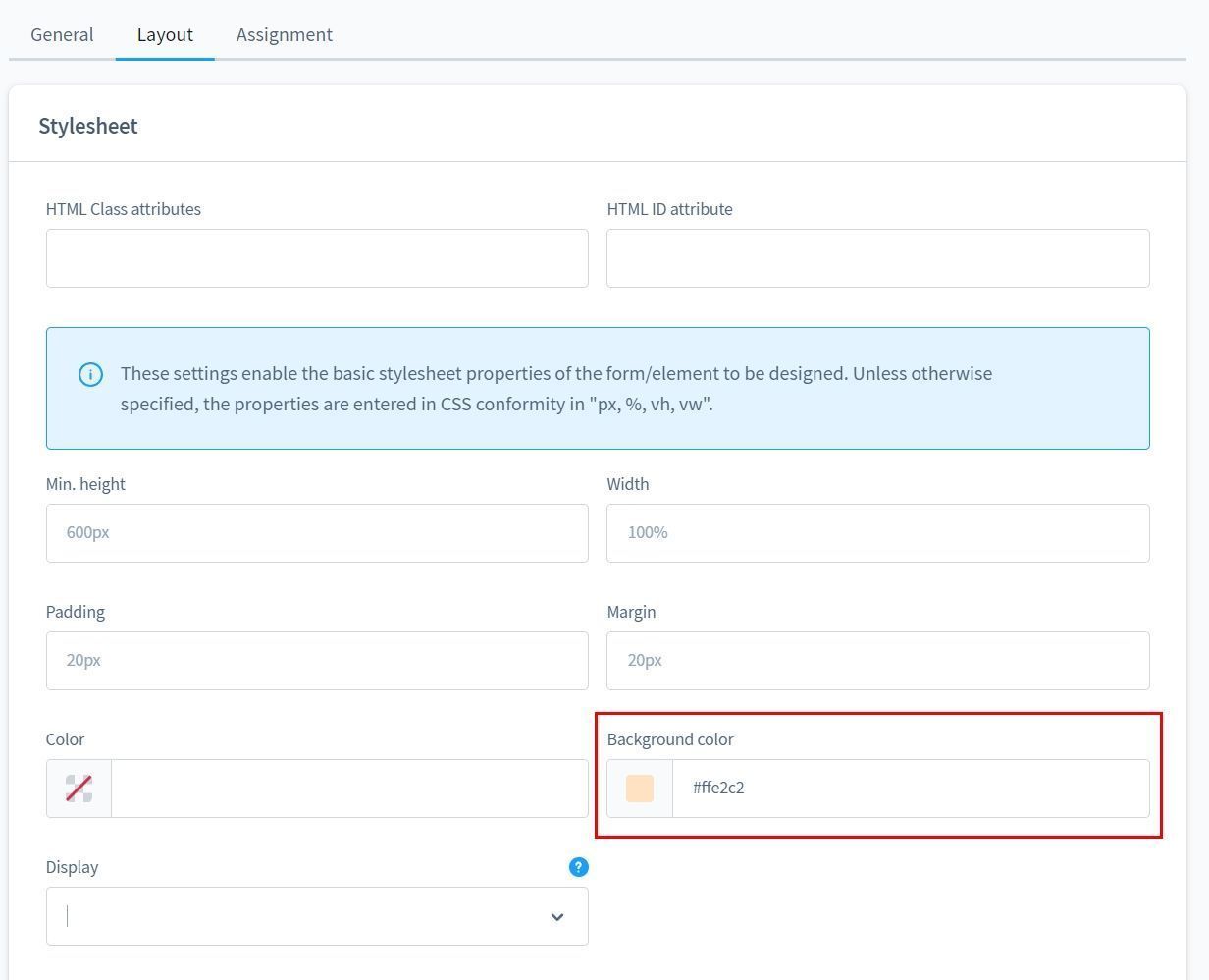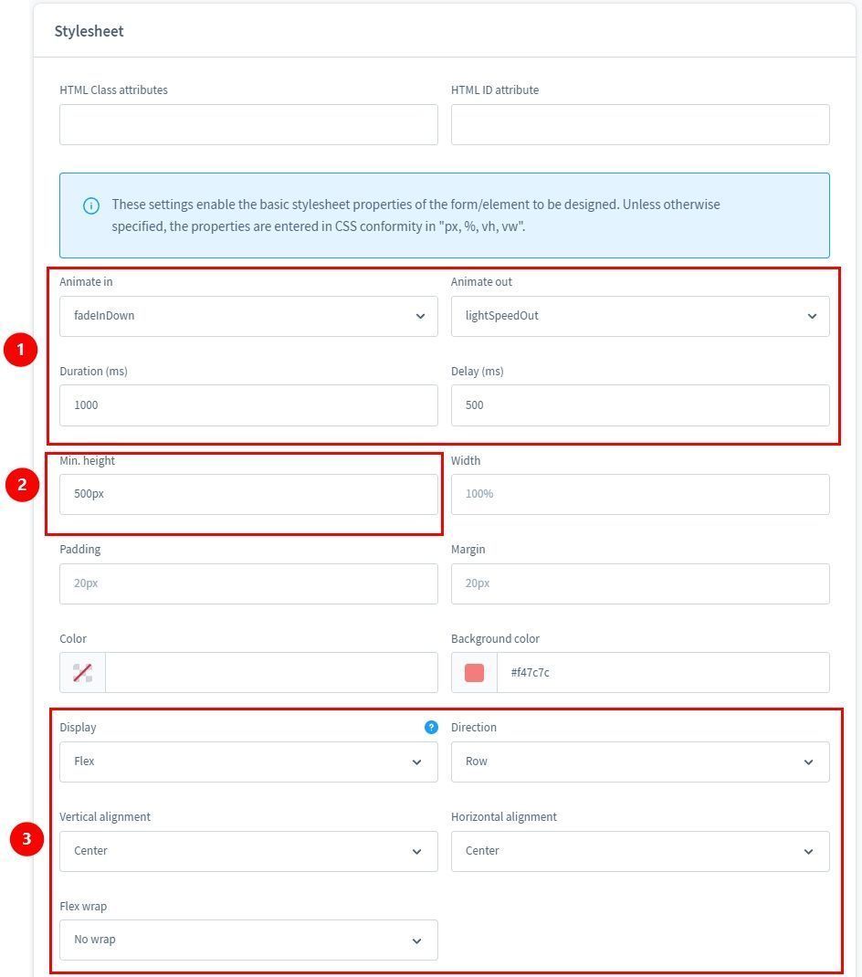 Die Stylesheet Einstellungen sind essenziell für das Element, hier kannst du folgende Konfigurationen machen: