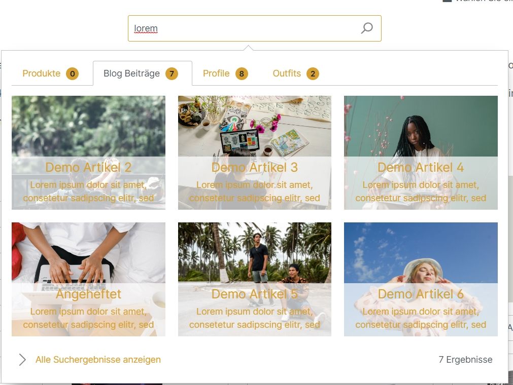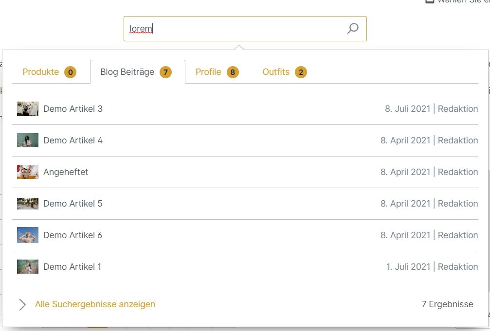 Die erweiterte Suche besteht aus der Schnellsuche, die dynamisch auf jeder Shopseite verfügbar ist und der Such-Seite. Diese kannst du auch nach Bedarf aktivieren und deaktivieren. Außerdem kannst du bestimmen, wie viele Suchergebnisse maximal angezeigt werden dürfen.