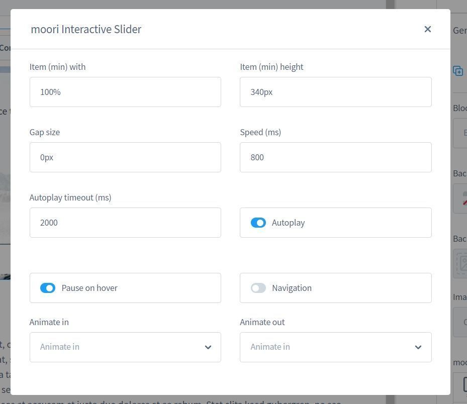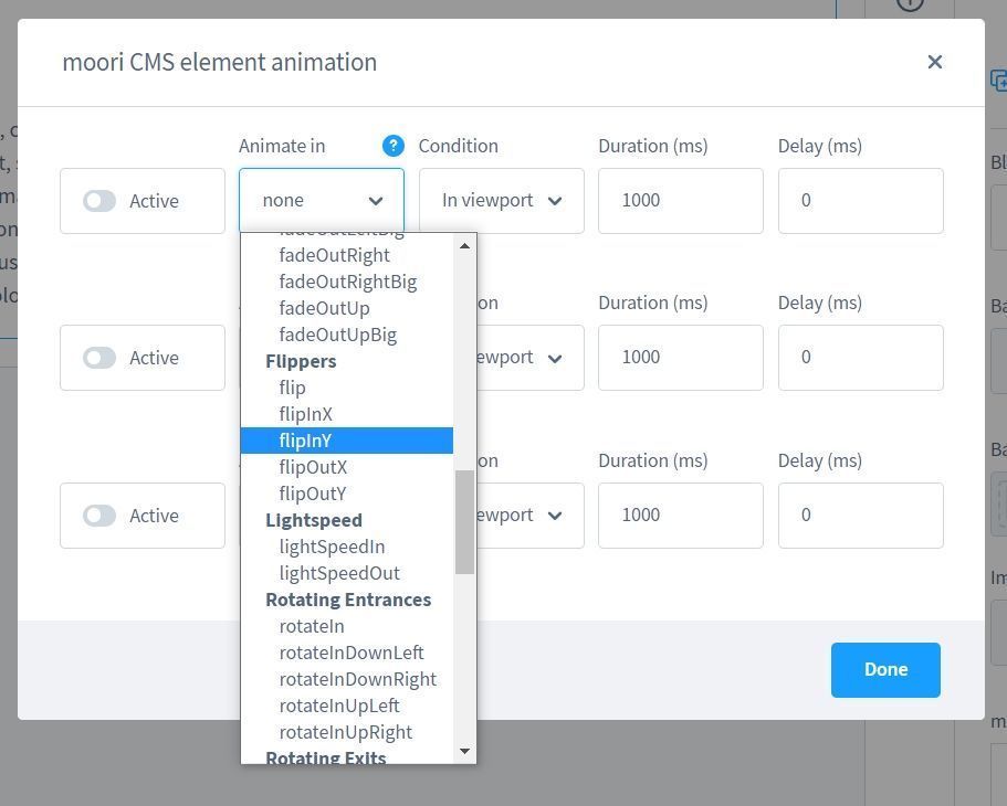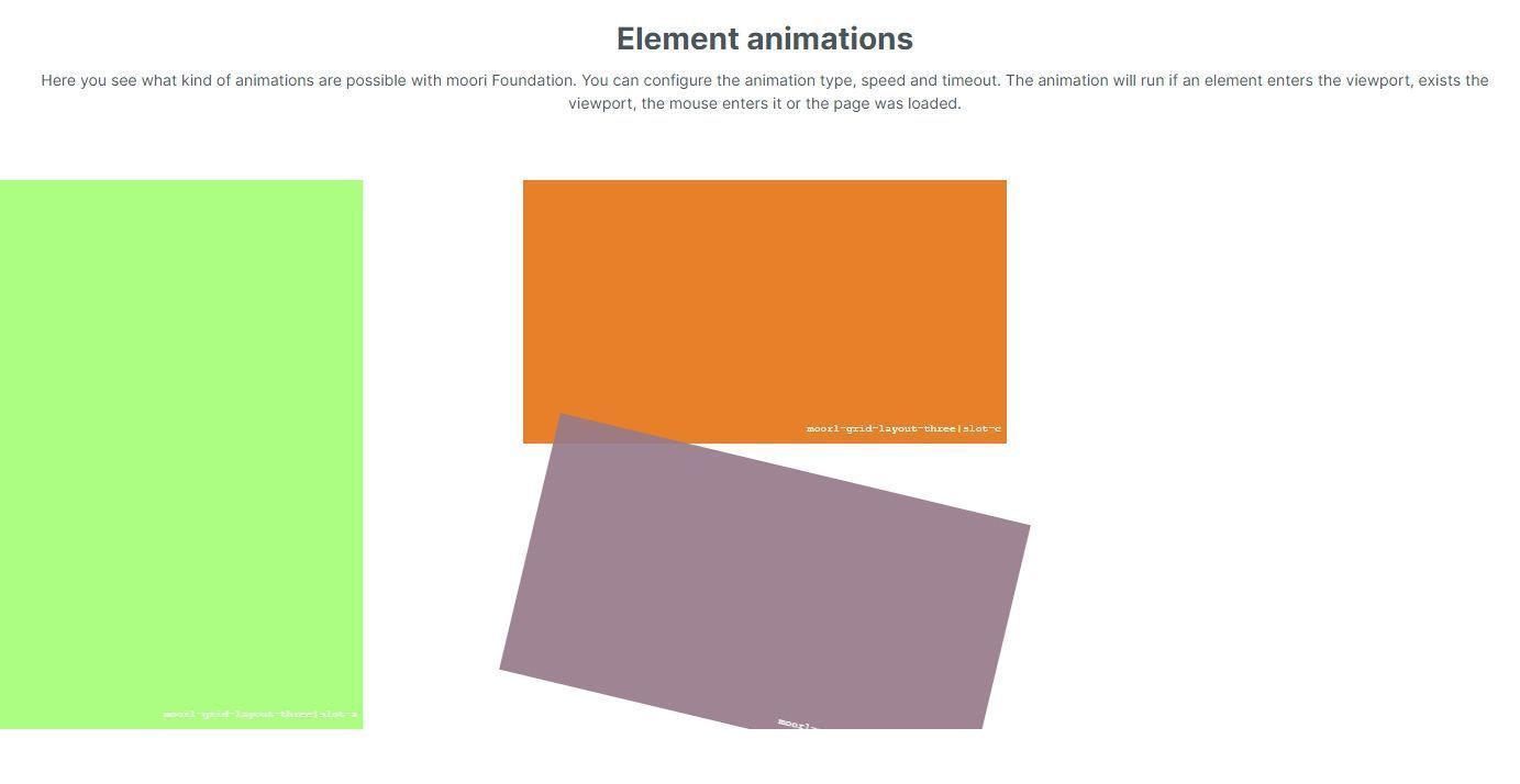 Jedes Element, welches sich in einem moori Spalten/Grid Block befindet kann mit vielseitigen Animationen ausgestattet werden. Es gibt drei Typen für Animationen: