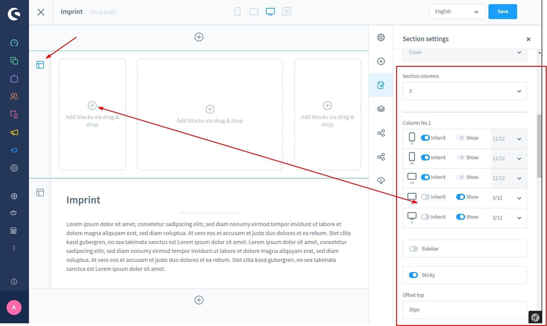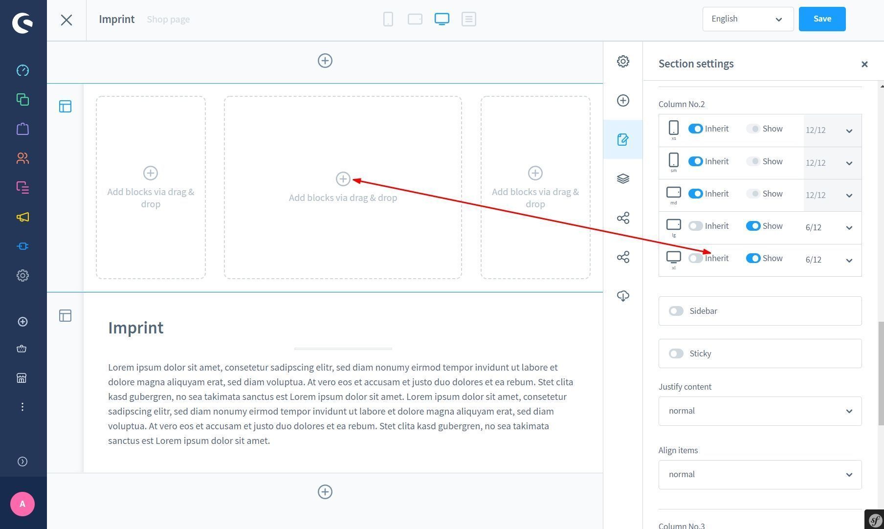 Hier lassen sich die CMS Blöcke je nach Endgerät/Bildbreite anzeigen oder ausblenden.