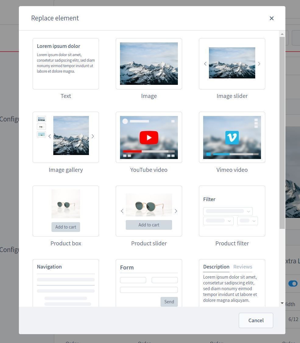 Wähle nun eine Element aus deinen CMS Elementen aus. Sofern du bereits Elemente konfiguriert hast, kannst du diese mit dem Replacer laden.
