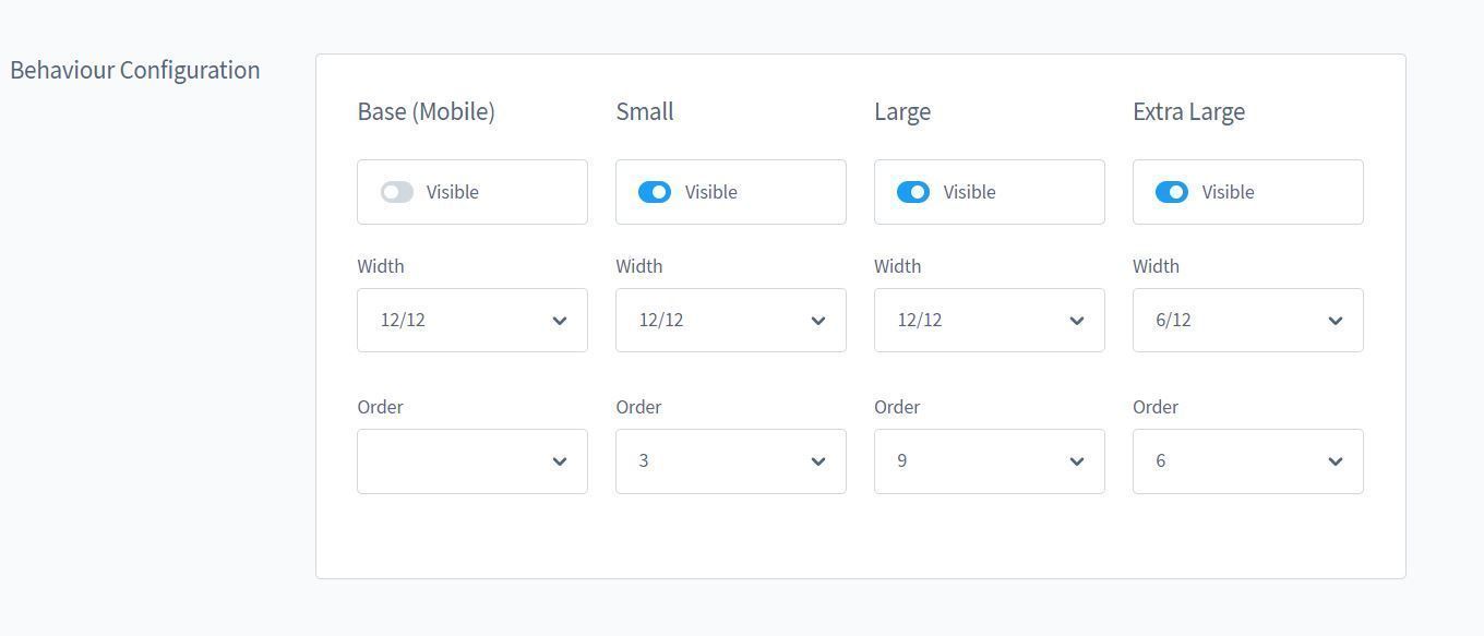 In der Verhaltenskonfiguration kannst du bestimmen auf welchen Endgeräten der Störer angezeigt wird, welche Breite dieser hat und an welcher Position er angezeigt werden soll. Die Breite wird durch das Bootstrap Grid System bestimmt. Wir empfehlen bei kleinen Geräten immer die volle Breite (12/12) zu nutzen.