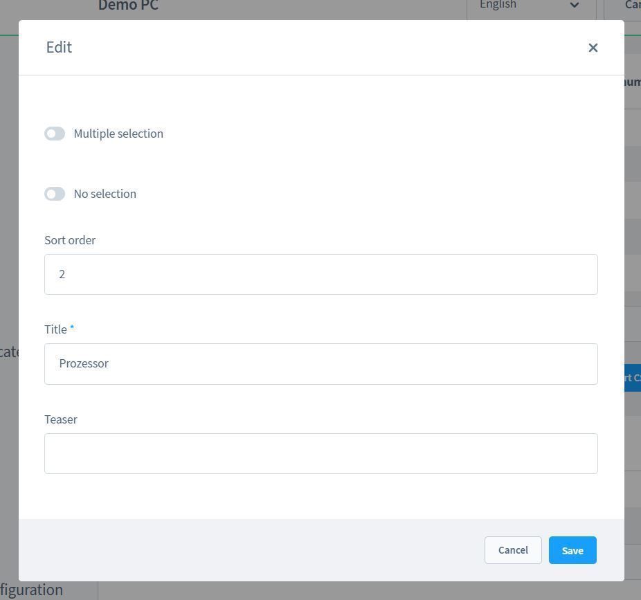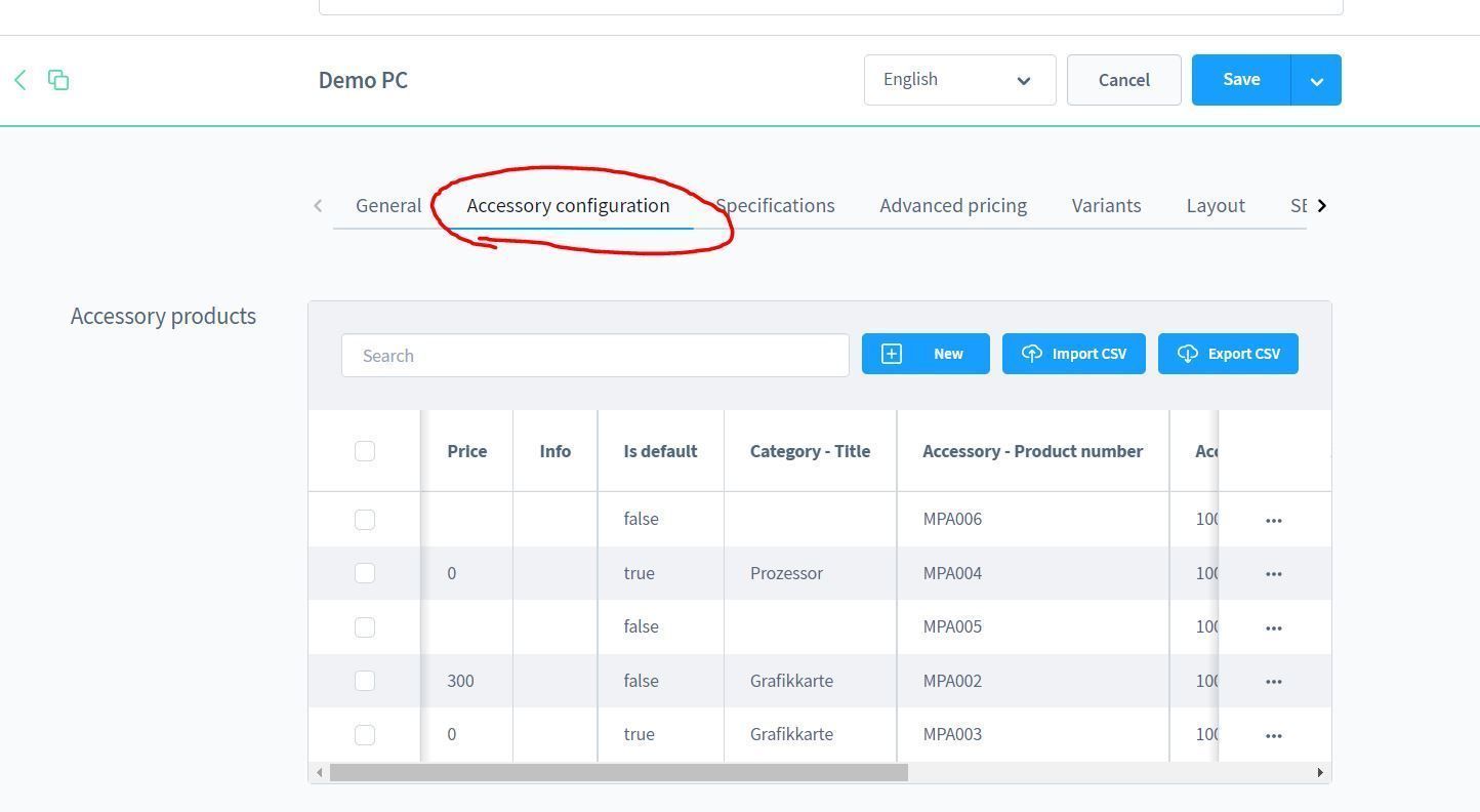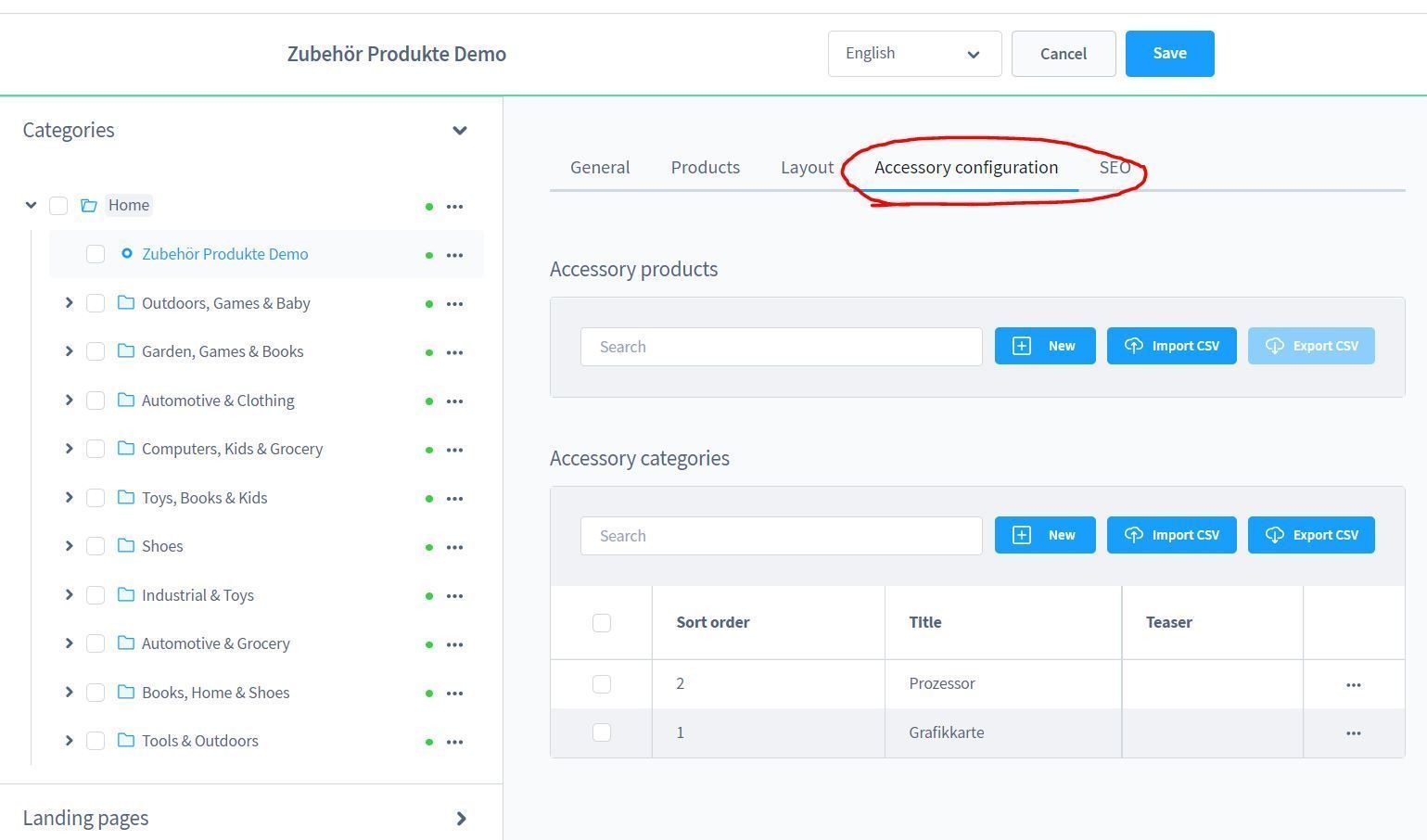 Sofern sich die Konfigurationen mehrfach wiederholen, lohnt es sich die Konfigurationen auf Kategorie-Ebene zu erstellen. Dabei werden alle Produkte, die mit dieser Kategorie verbunden sind berücksichtigt.