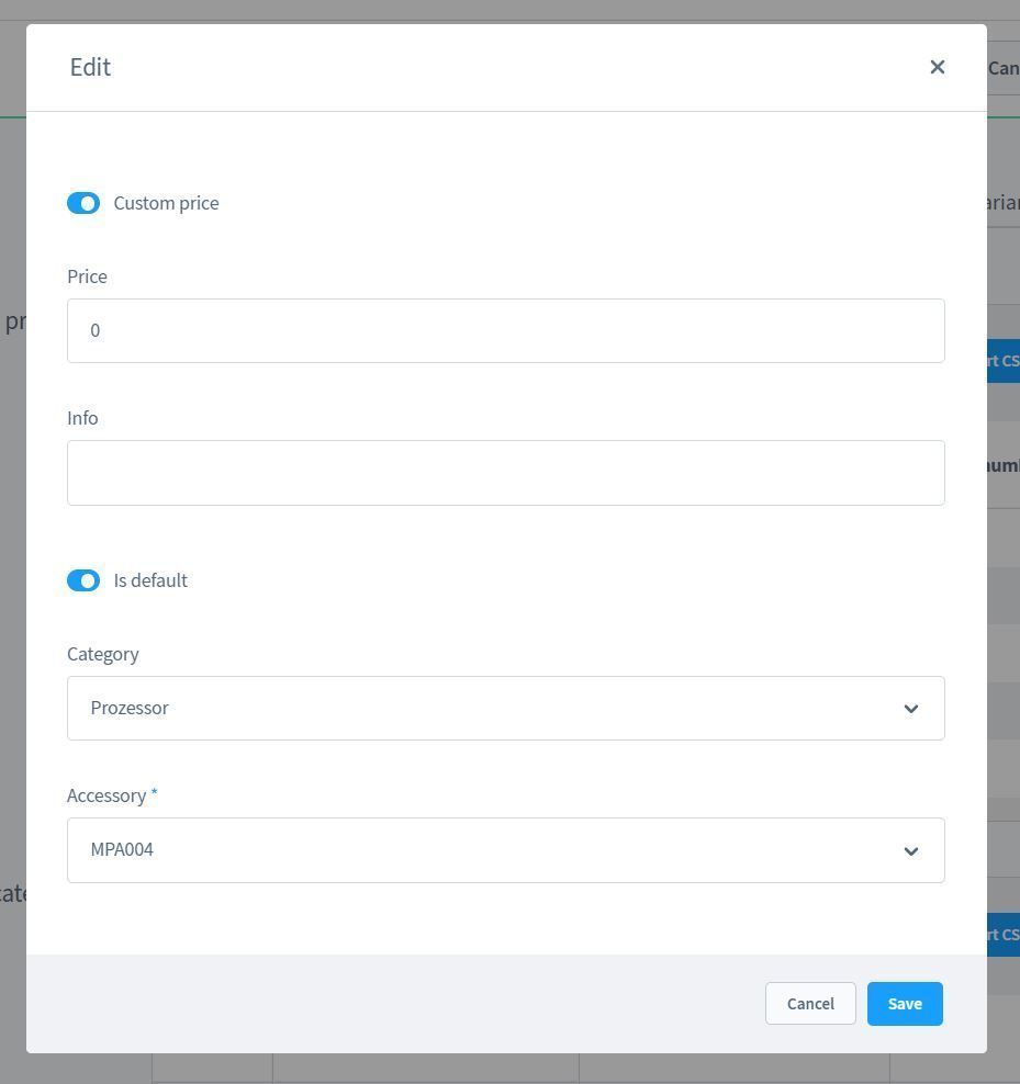 Hier kannst du nun die Add-Ons/Zubehörprodukte konfigurieren. Du hast folgene Möglichkeiten bzgl. der Preisgestaltung: